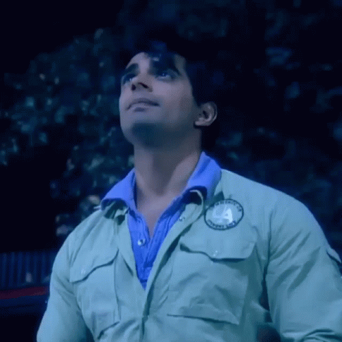 Karan Singh Grover, also known as KSG, looks up and points in a thoughtful moment.