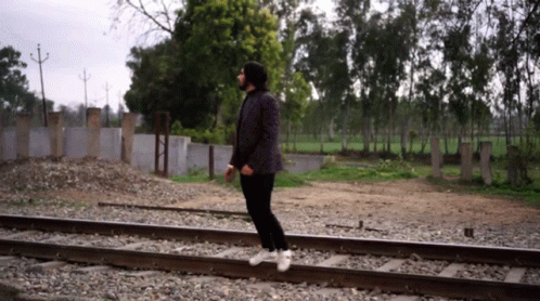 Asad Ansari walks on train tracks as a train passes by, showcasing courage near the railway crossing.