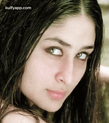 Kareena Kapoor's captivating close-up, featuring her striking green eyes and wet hair and an intense expression.