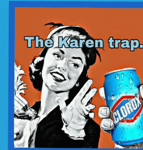 A woman, embodying the 'Karen' stereotype, holds a Clorox can in this 'Karen trap' meme.