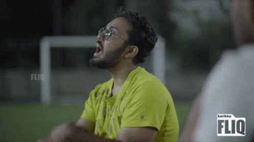 A man in a yellow Karikku FLIQ shirt and glasses gestures animatedly on a sports field, likely a comedy sketch.