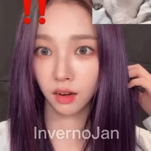 Karina from Aespa, also known as Yoo Jimin, with purple hair, showing a surprised and shocked expression.