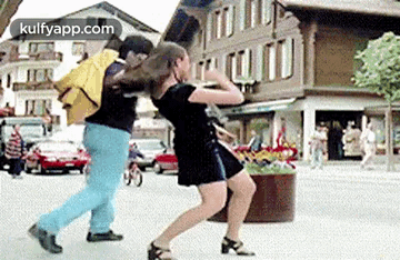 Karisma Kapoor and Govinda dancing energetically on a European street, with buildings and cars in the background.