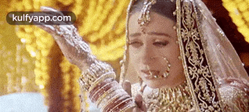 Karisma Kapoor, adorned in traditional Indian bridal wear, appears emotional, possibly crying, in a poignant scene.