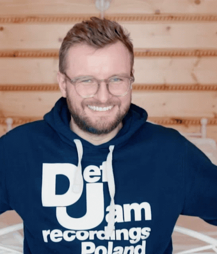 Karol Paciorek, wearing a DJ Jam Recordings Poland hoodie, says 'Przepraszam' with a changing expression.