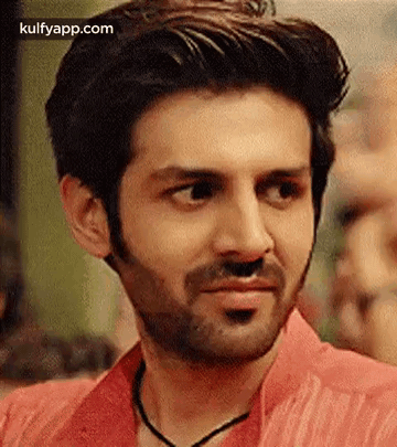 Kartik Aaryan looking to the side with a subtle expression, wearing a red shirt.