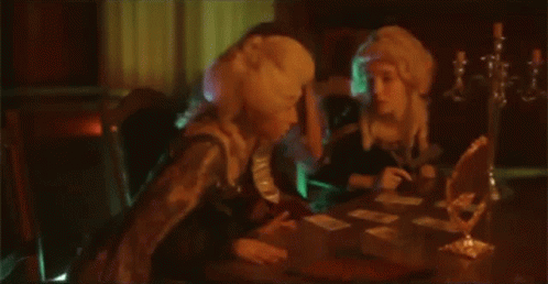 Two women react with shock and fear while fortune-telling with tarot cards at night.