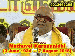 Muthuvel Karunanidhi (Kalaignar) delivering a speech, wearing sunglasses and a yellow scarf.
