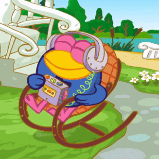 Карыч from Kikoriki relaxing in a rocking chair, listening to music with headphones and a cassette player.