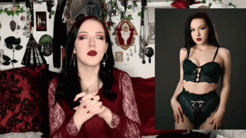 Katherine Youtube discusses and models gothic lingerie, featuring a black bra and fishnet details.
