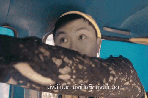 A katoey in a tuk-tuk asks if someone has a license, with an animated expression and gestures.