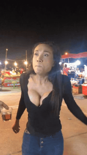 A confident katoey in a black top with a plunging neckline at a bustling Thai night market.