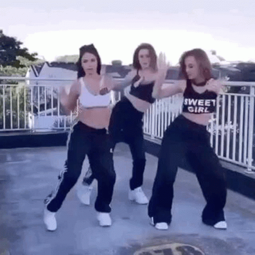 Bella, Flavia, and Mayra from Katz Vida De Katz perform a synchronized dance routine on a balcony.