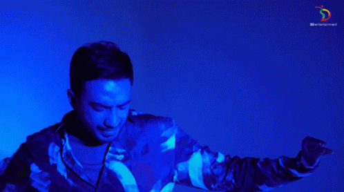 Reza Zakarya performing 'Kau Buat Ku Bahagia' in a floral shirt under blue light, from 3D Entertainment.