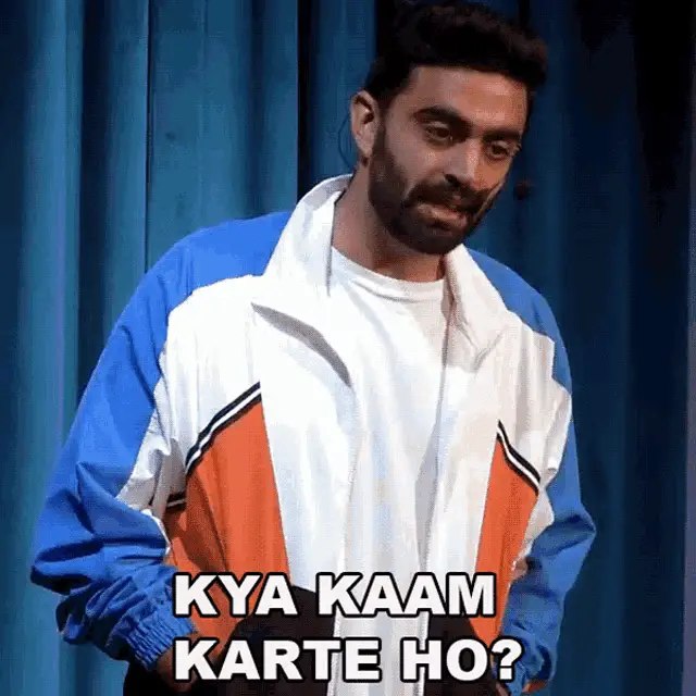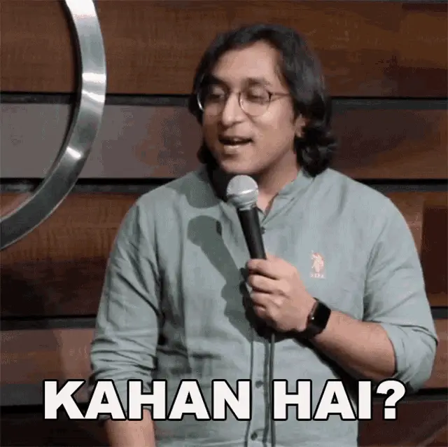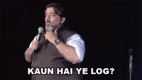 Comedian Jeeveshu Ahluwalia on stage, asking the iconic question 'Kaun Hai Ye Log?'