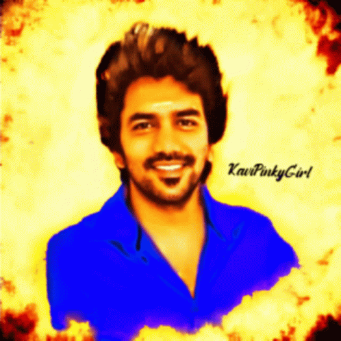 A vibrant, stylized portrait of Kavin Vetrimagan smiling, surrounded by a fiery, glowing aura.