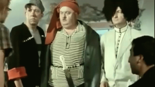 Shurik and Nikulin in a classic scene from 'Caucasian Captive', exchanging greetings with other characters.