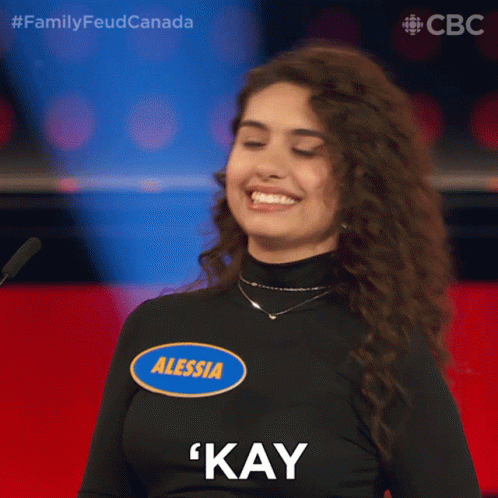 Alessia Cara on Family Feud Canada, smiling and saying 'Kay' while wearing a black turtleneck.