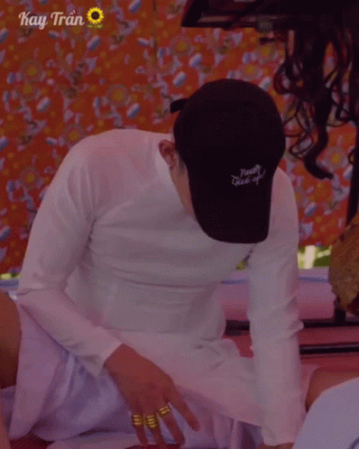 Kay Tran from Mtptalents, wearing a "Never Give Up!" hat, sits on the floor and looks up with a smile.