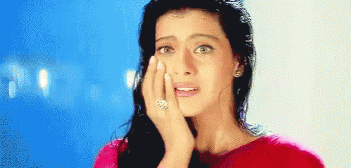 Kajol looks surprised and concerned, holding her hand to her face in a moment of shock.