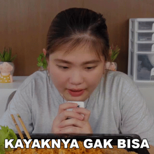 Fifin Liefang reacts with 'Kayaknya Gak Bisa' while looking at her phone and eating noodles.