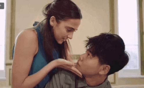 Kaycee Rice and Sean Lew share a tender moment, with Kaycee touching Sean's face and their foreheads touching.