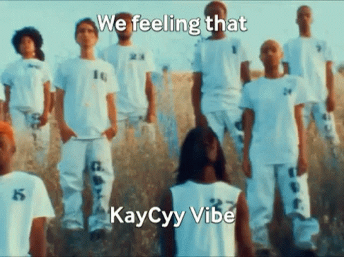 Kaycyy and a group of people in a field, embodying the 'We Feeling That KayCyy Vibe' with Kanye's influence.