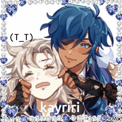 Kaeya playfully interacts with Albedo, featuring the text 'kayriri' and '(T_T)' in a Genshin Impact fan art.
