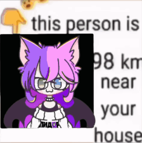 Animated character Kazka, with cat ears and bat wings, as text indicates they are now 0 km near your house.