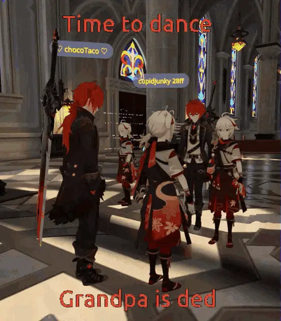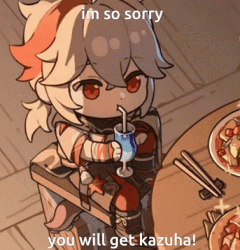 An adorable chibi Kazuha from Genshin Impact drinks from a glass, with a humorous caption about getting Kazuha.