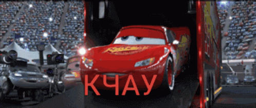 Lightning McQueen emerges from a truck, ready for action, with his iconic 'Kachow' catchphrase.