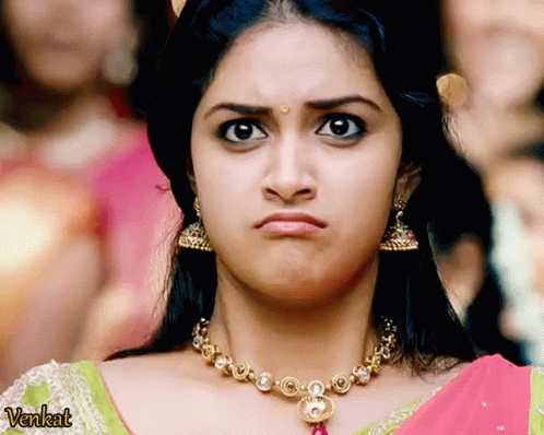 Actress Keerthy Suresh, portraying Karthika Devi, pouting with a displeased expression, wearing traditional Indian jewelry.