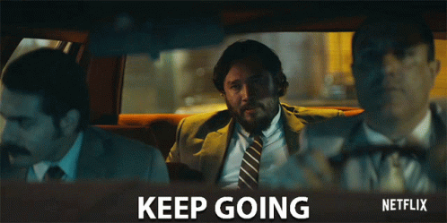 Three men in suits, including a bearded man, in a car with 'KEEP GOING' text and Netflix logo, from Narcos.