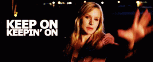 Kristen Bell as Veronica Mars, standing in front of a sign that reads "Keep On Keepin' On".