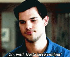 Taylor Lautner says 'Oh, well. Gotta keep smiling!' with a shrug and a smile.
