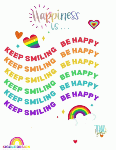 A vibrant Kiggle Design graphic featuring rainbow text 'Keep Smiling Be Happy' and cheerful illustrations.