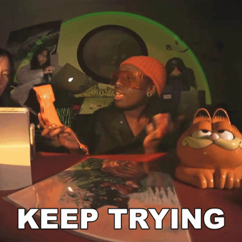 Ronnica holds a 'Keep Trying' sign next to a Garfield statue, conveying a motivational message.