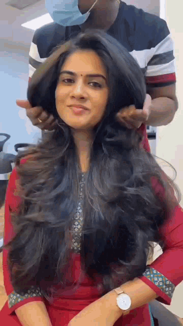 Keert showcases her long, voluminous layered haircut, styled by a professional hairdresser in a salon.