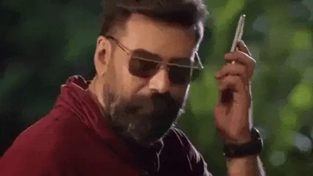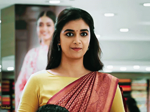 Keerthy Suresh looks elegant in a yellow top and a red saree, smiling gently at the camera.
