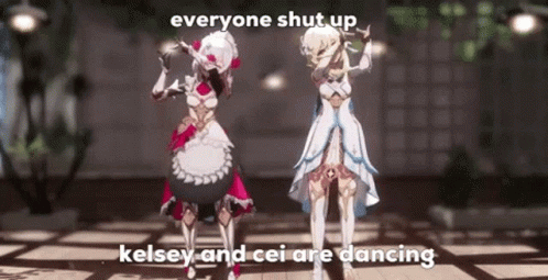 Kelsey and Cei, two anime characters, show off their dance moves in a video game setting.