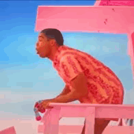 Ken from the Barbie movie looking disgusted on a pink lifeguard tower, wearing a pink shirt.