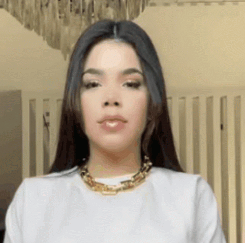 Kenia Os posing for the camera in a white shirt and a prominent gold chain necklace.