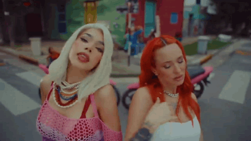 Kenia Os and La Joaqui in a vibrant music video, featuring colorful street scenes.