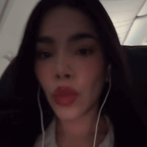 Kenia Os on a plane, making a kissing face with earphones, then playfully blocking the camera.