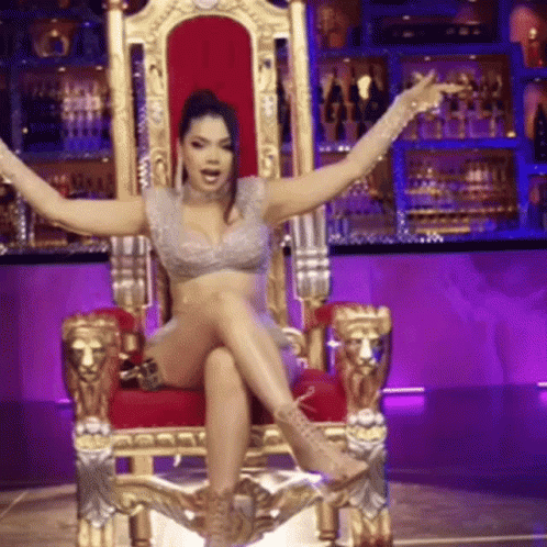 Keniaos Joder sits regally on an ornate golden throne with arms outstretched in a vibrant bar setting.
