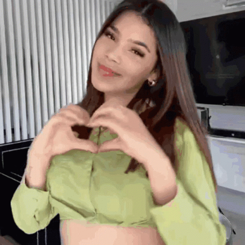 Keniaos Keninis smiles and makes a heart shape with her hands in a light green crop top.