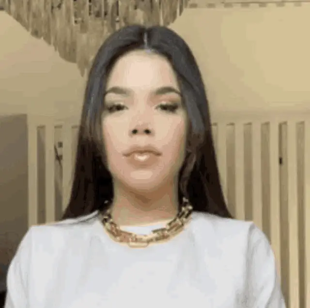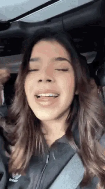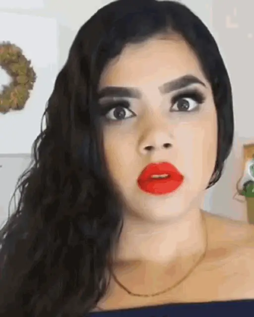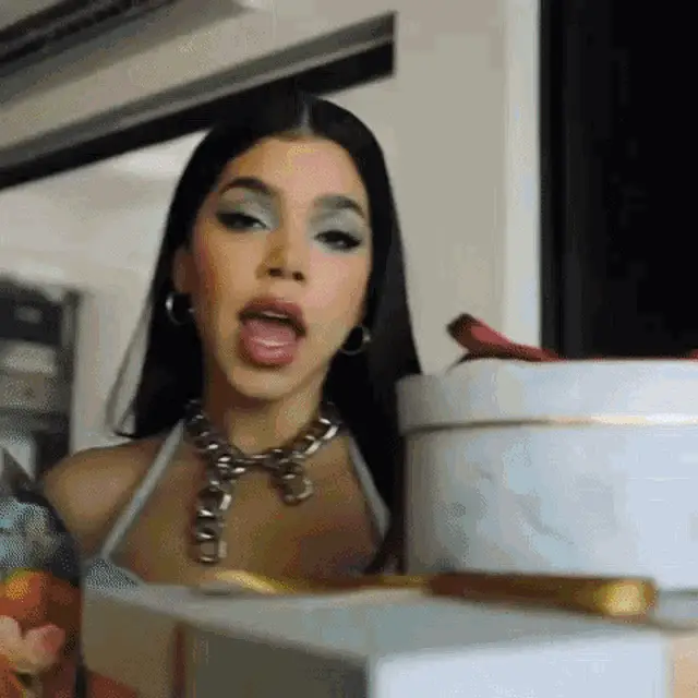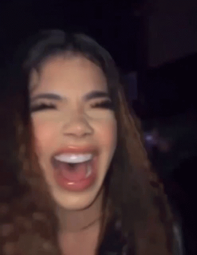 Kenia Os making a funny face with her mouth wide open and eyes closed, expressing strong emotion in a dim setting.