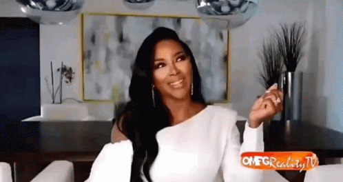 Kenya Moore reacting with a hand to her head, looking expressive in a white top.