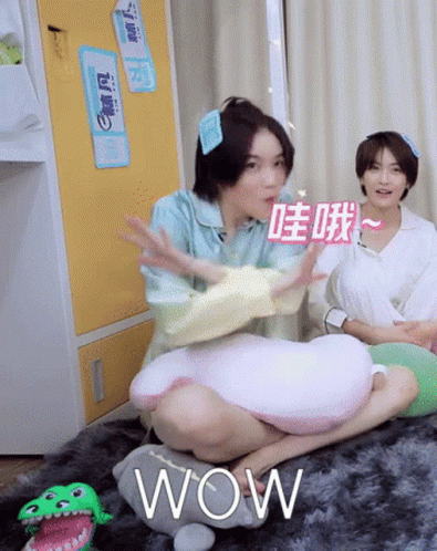 Lu Keran sits on the floor, reacting with an energetic 'WOW' while holding a pillow.