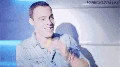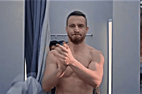 Kerem Bursin shirtless, making hand gestures and looking at the camera with a confident expression.